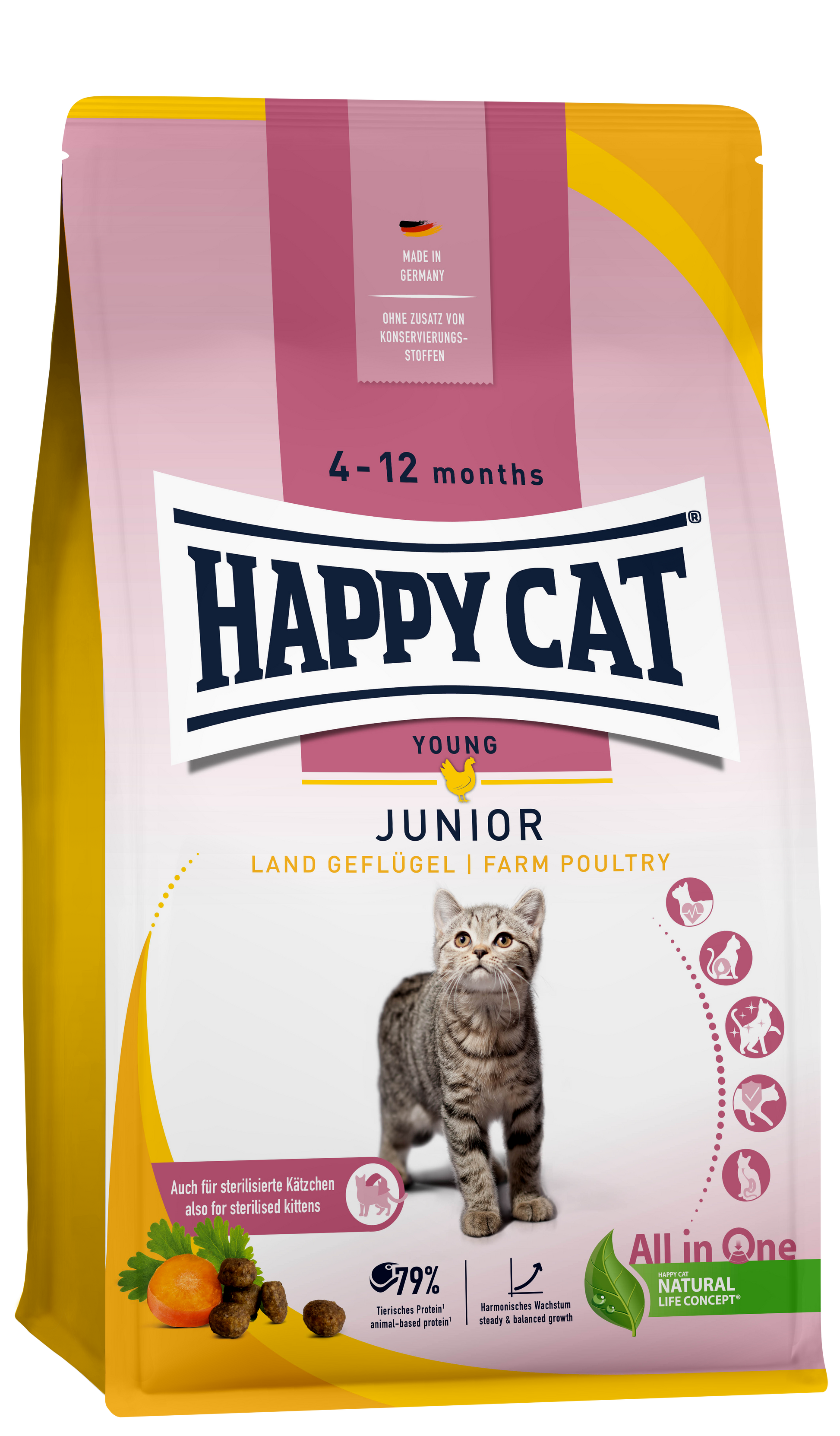 Junior food can be fed from as early as 4 months of age, as this is when your kitten is in the second growth phase, when weight gain slows down. When changing from kitten food to junior food, it is recommended to do so slowly and without damaging your kitten's stomach. For this purpose, you can mix the junior food with the kitten food over a period of eight to ten days, increasing the amount daily. This way your sensitive kitten can get used to the new food without any problems. With Happy Cat Junior Country Poultry you can meet the nutritional requirements of your young cat and create the best basis for a vital cat life. The kibbles of our Junior dry food are still small (approx. 4 x 7 mm), but slightly larger than the very small kibbles (approx. 4 x 5 mm) of the kitten food.