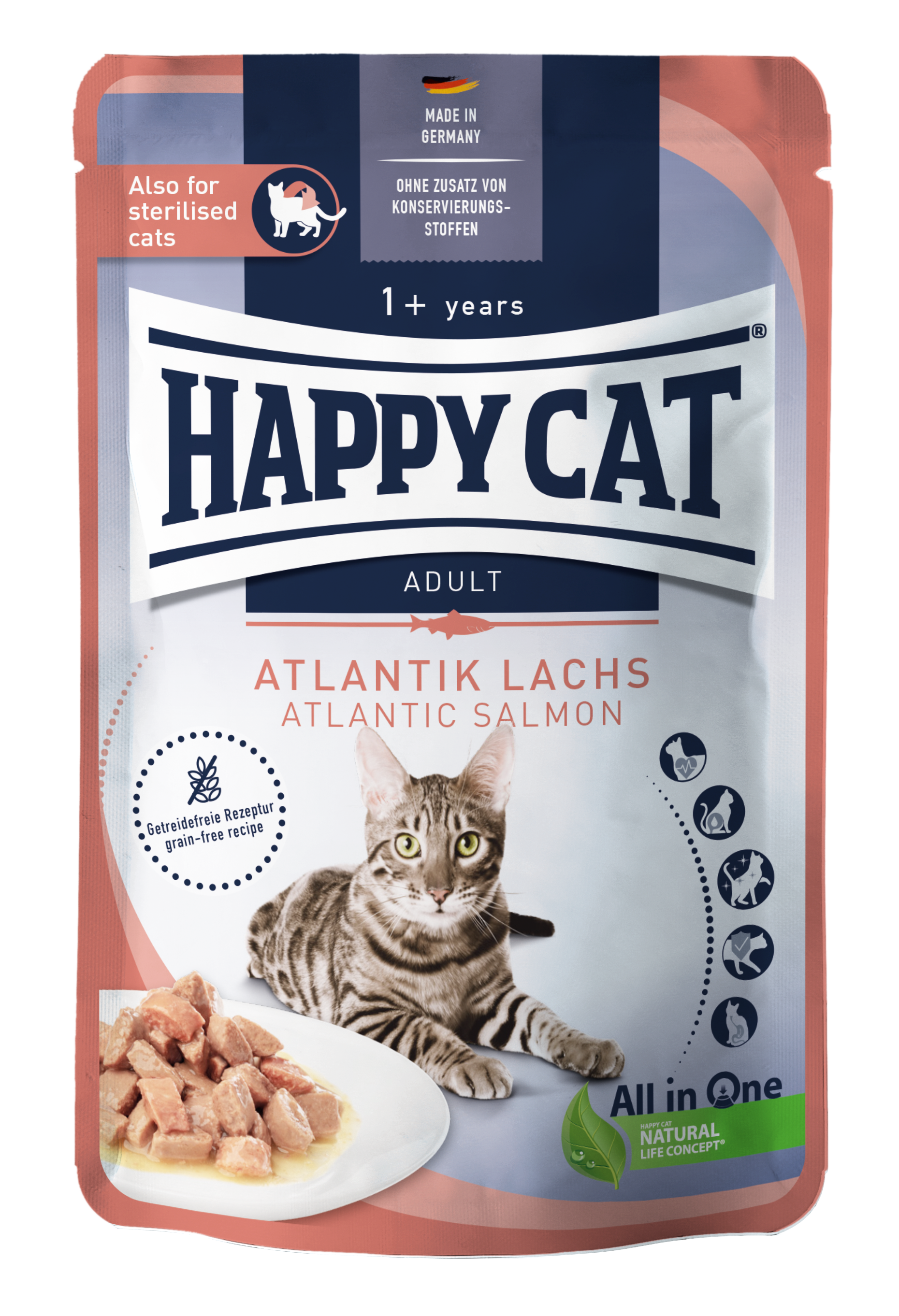 And how long can I leave wet food for cats standing? Wet cat food must always be fresh. Always divide it into portion sizes that will be eaten straight away. Meat in Sauce Culinary Atlantic Salmon is available in handy 85 g pouches that seal in freshness. Once opened, you can store Happy Cat wet cat food in the fridge for up to two days.