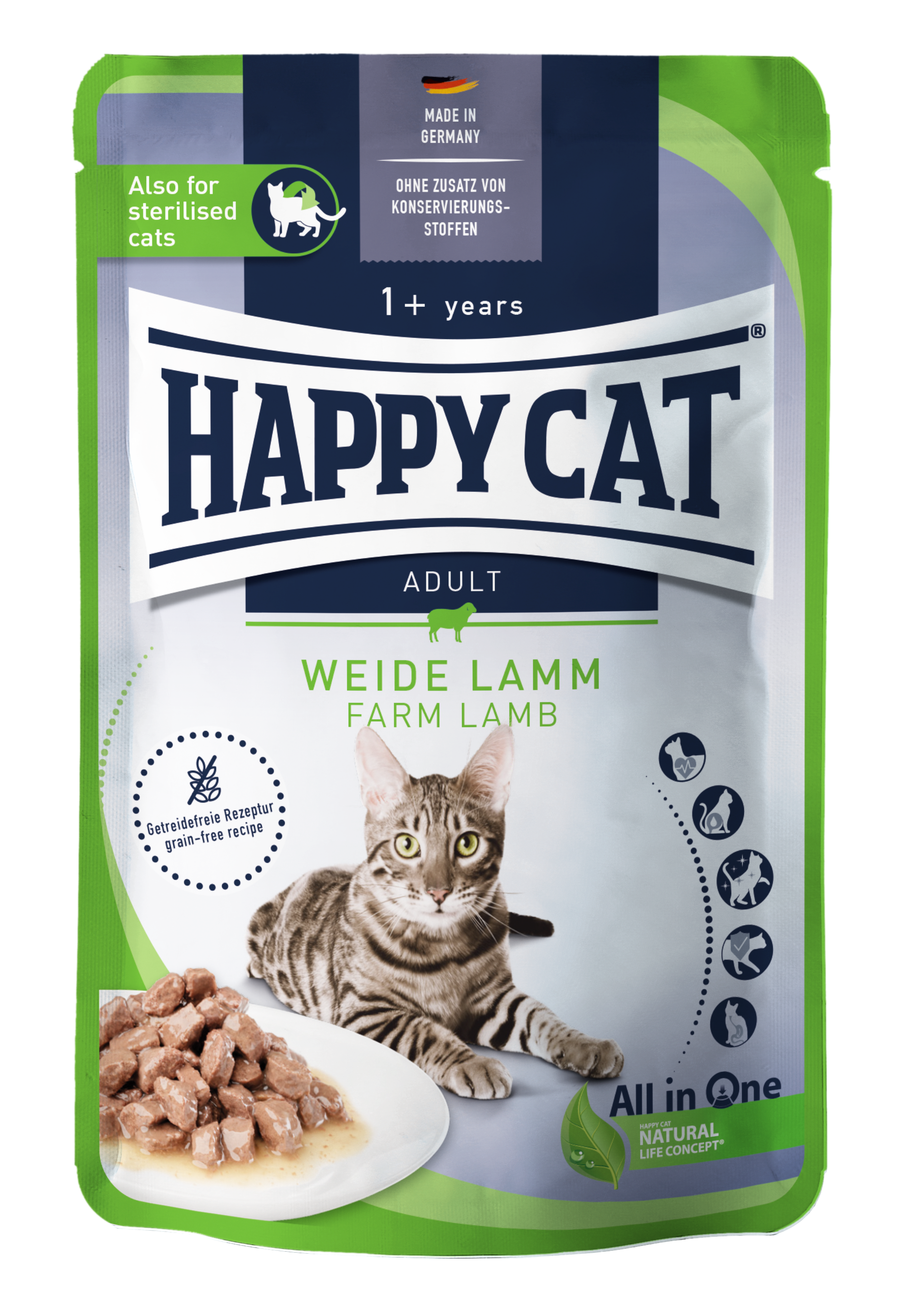Cats need wet food to maintain a healthy metabolism. Happy Cat Meat in Sauce Culinary Farm Lamb offers your feline friend over 90 percent animal proteins in the total protein, is easily tolerated by stomach and gut – and is extra tasty. This grain-free wet cat food with its high meat ratio is particularly suitable for male and female neutered and sterilised cats. The recipes for all Happy Cat wet food preparations were developed in close collaboration with vets and their nutritional benefits proven. Our Natural Life Concept® takes account of all the important points needed for balanced, species-appropriate cat nutrition. All the important vitamins and minerals are already contained in the wet food, so you do not need any other nutritional supplements. All-natural ingredients for high-quality wet food. Cats love it.
