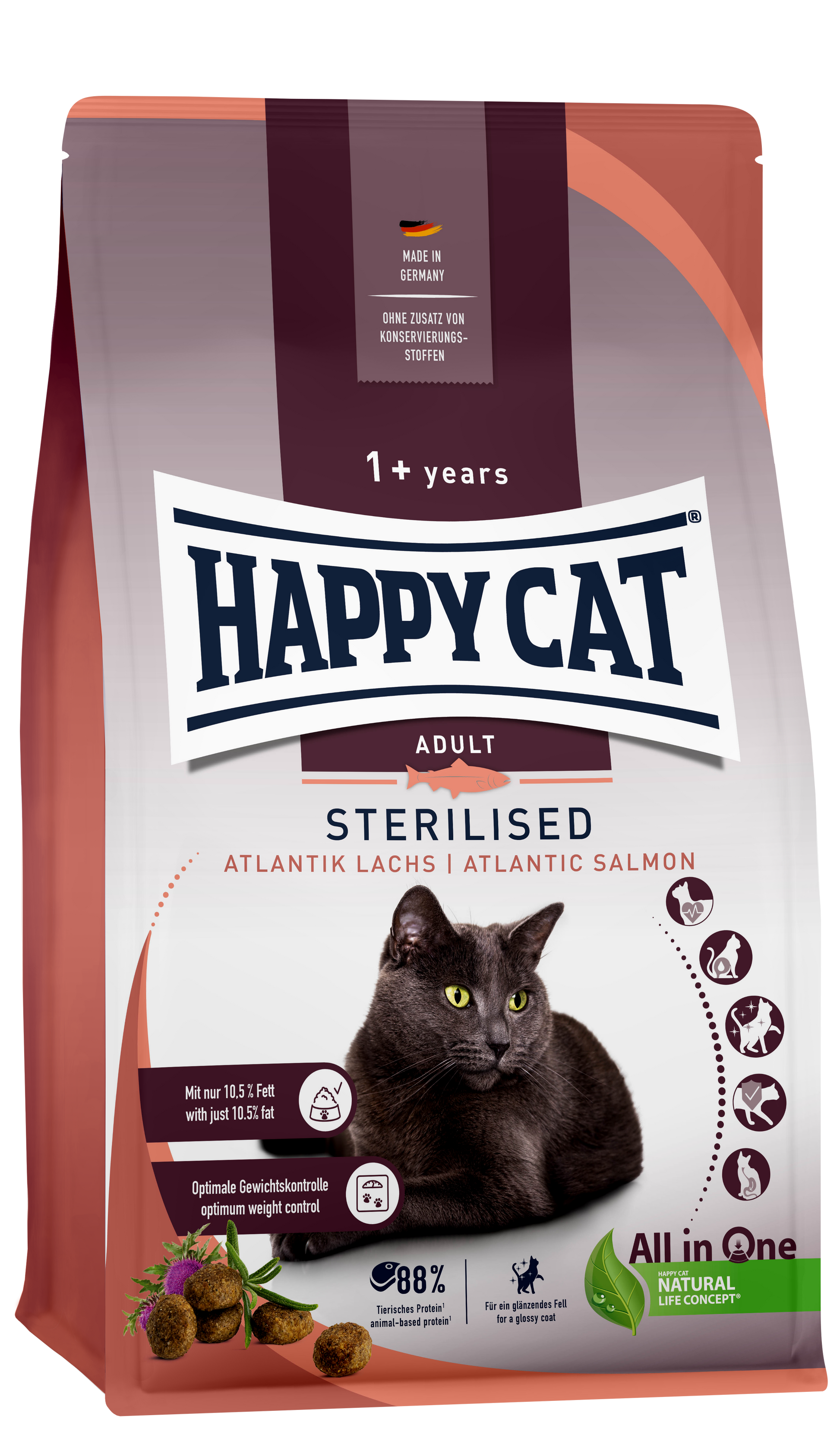 Velvet paws are spoilt with the recipe of easily digestible salmon, valuable rosemary and milk thistle. Salmon - rich in omega-3 fatty acids - and skin-active nutrients such as B vitamins and zinc support the skin and coat. With Happy Cat Sterilised Adult Atlantic Salmon, you are choosing a food that not only tastes good for your neutered cat, but is also good for its skin and coat. Thanks to the reduced fat content of 10.5 %, possible weight gain can be avoided. For hormonal reasons, neutered cats are hungrier than before neutering, even though their metabolism has changed and they actually need less energy. It is therefore important after neutering to switch to a food that satisfies your cat well with fewer calories.