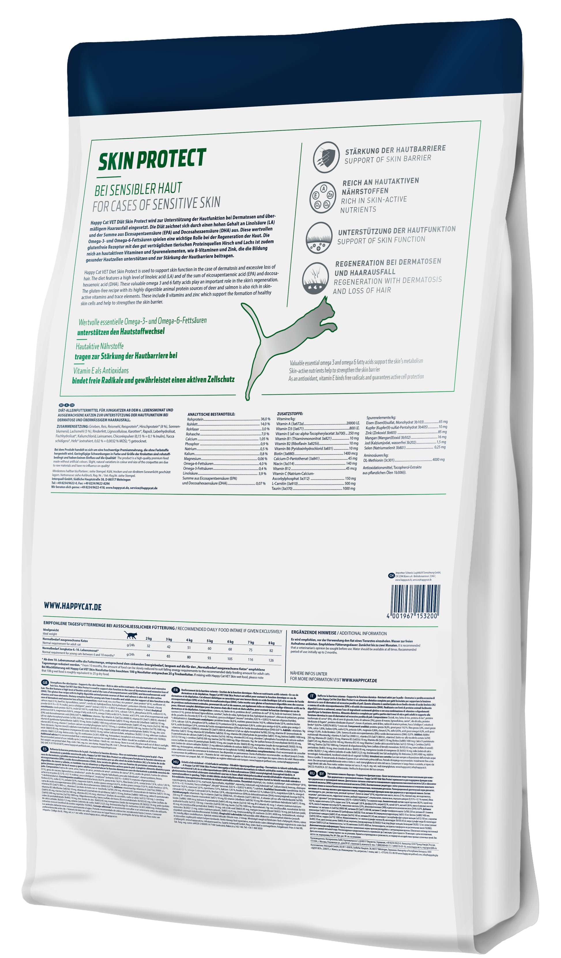 - For best effect feed Happy Cat VET Diet Skin Protect exclusively. Discuss any complementary feeds with your vet.