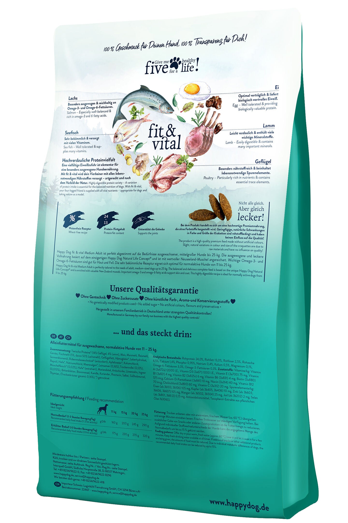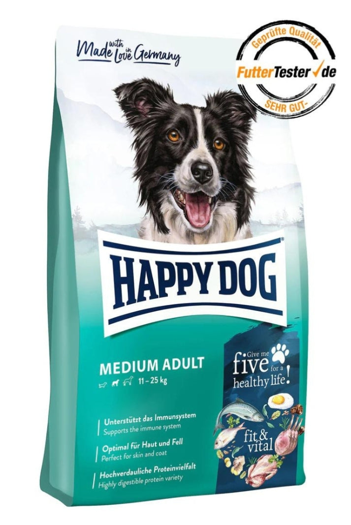 Happy Dog fit & vital Medium Adult is tailored to the requirements of adult, mid-sized dogs, and is ideal for normally active dogs from 11 to 25 kg. The tasty, balanced all-in-one food is based on the unique Happy Dog Natural Life Concept® and is enriched with valuable New Zealand mussels for greater mobility. Important Omega-3 and Omega-6 fatty acids ensure healthy skin and a shiny coat. This very easily digestible, gluten-free formulation supports the immune system with vitamin C and specially selected herbs, giving your dog a healthier, happier life.