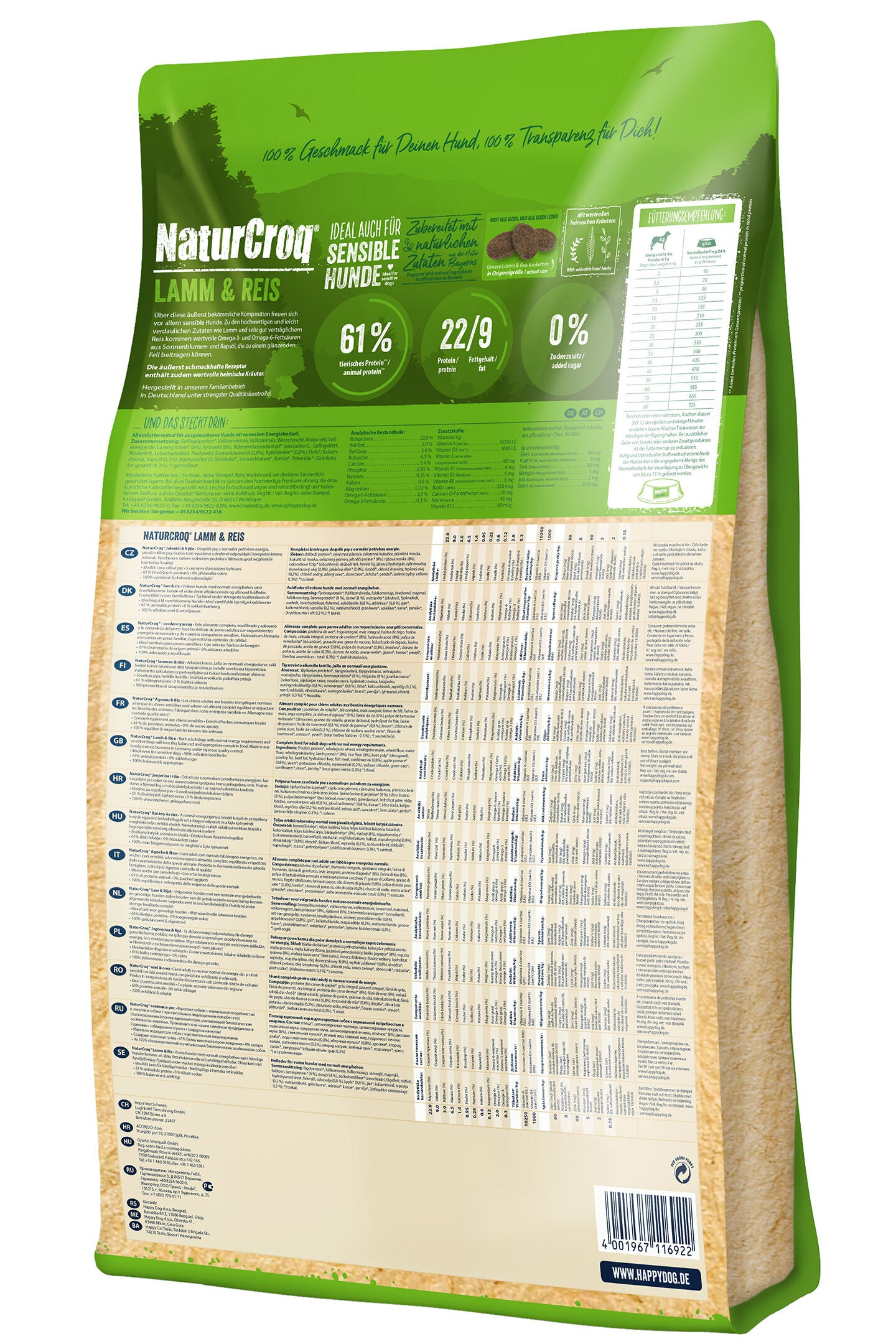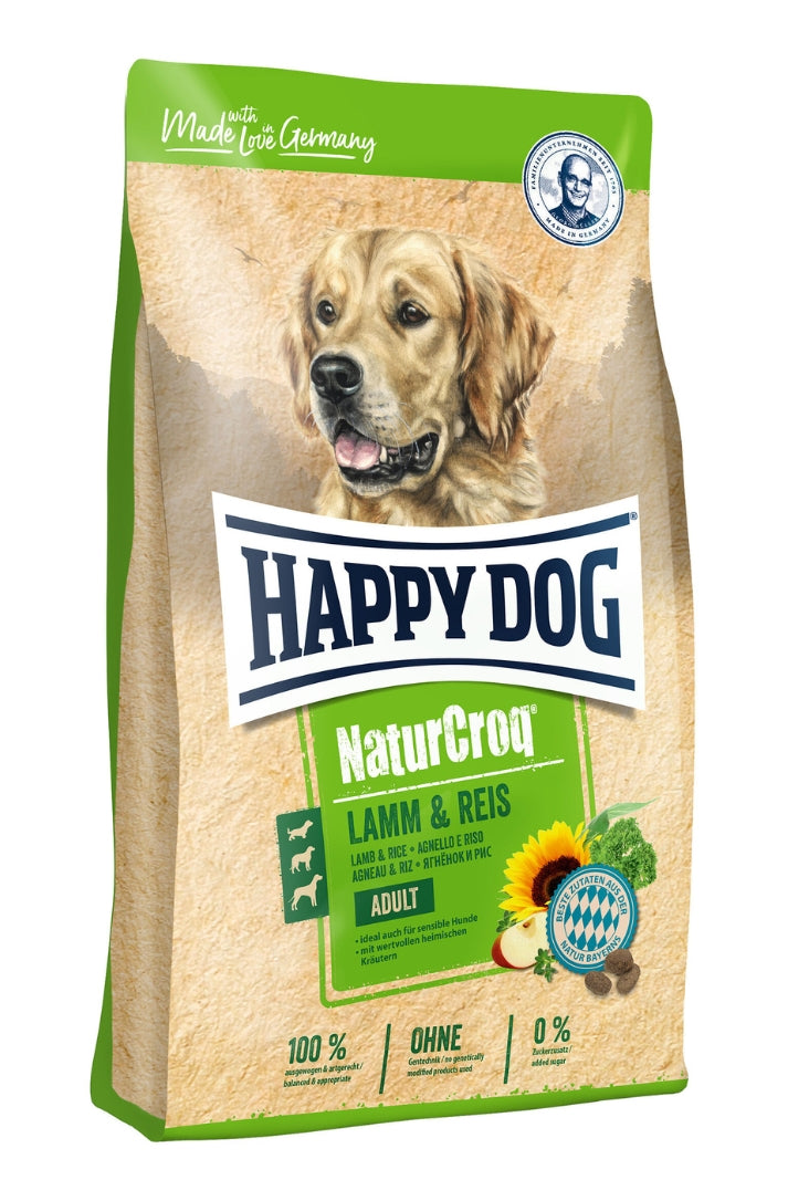 Does your dog have a sensitive gastro-intestinal tract? Then they’ll love Happy Dog NaturCroq Lamb & Rice, the easy to digest all-in-one food made from the best ingredients from Bavaria. The tasty, hard-baked kibbles contain only the best quality ingredients – easily digestible lamb, well-tolerated rice and healthy whole grain from the local area. The lamb meat provides your pet with high-value animal protein, and the rice is an excellent source of carbohydrate and is gentle on the stomach and intestine. Whole-grain products provide important fibre. In addition, they regulate the bowel function, satisfy the appetite, and promote digestion. They can also act to support intestinal health. What’s more, they supply numerous B vitamins and minerals, such as magnesium, iron, selenium and zinc, and are full of complex carbohydrates. The tasty formulation is rounded off with locally-grown herbs, to provide your four-legged friend with a range of valuable nutrients from a natural source.