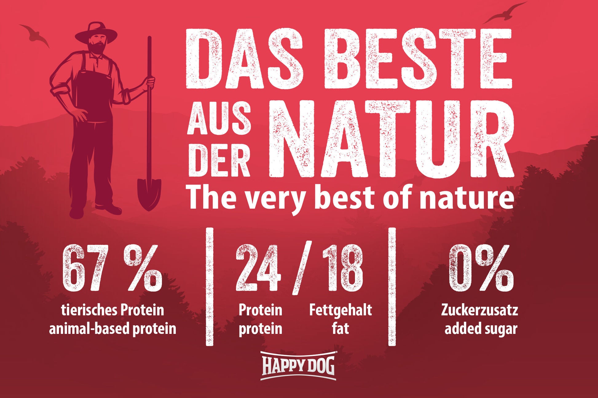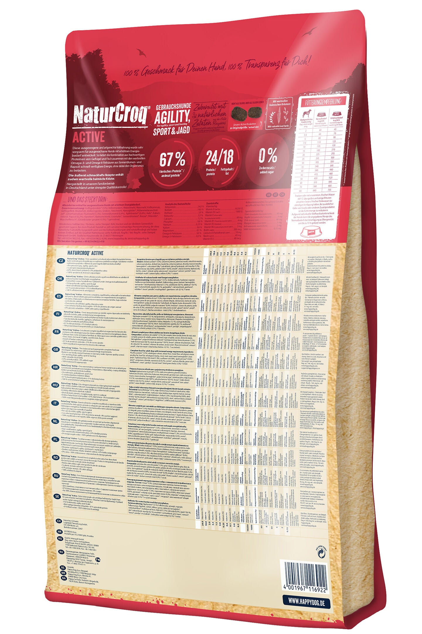 This balanced, species-appropriate complete food, made from the best natural ingredients from Bavaria, has been developed to take good care of adult dogs with higher energy requirements. The combination of high-value protein from poultry and fish, together with valuable Omega-3 and Omega-6 fatty acids from sunflower oil and rapeseed oil, delivers readily available energy without over-burdening the system. Whole-grain products are valuable sources of fibre. They also regulate the intestinal functions and promote digestion, and can support intestinal health. What’s more, they supply numerous B vitamins and minerals, such as magnesium, iron, selenium and zinc, and are full of complex carbohydrates. This tasty formulation also contains valuable locally-grown herbs. NaturCroq Active is the perfect food for all dogs with higher energy and protein requirements.Â