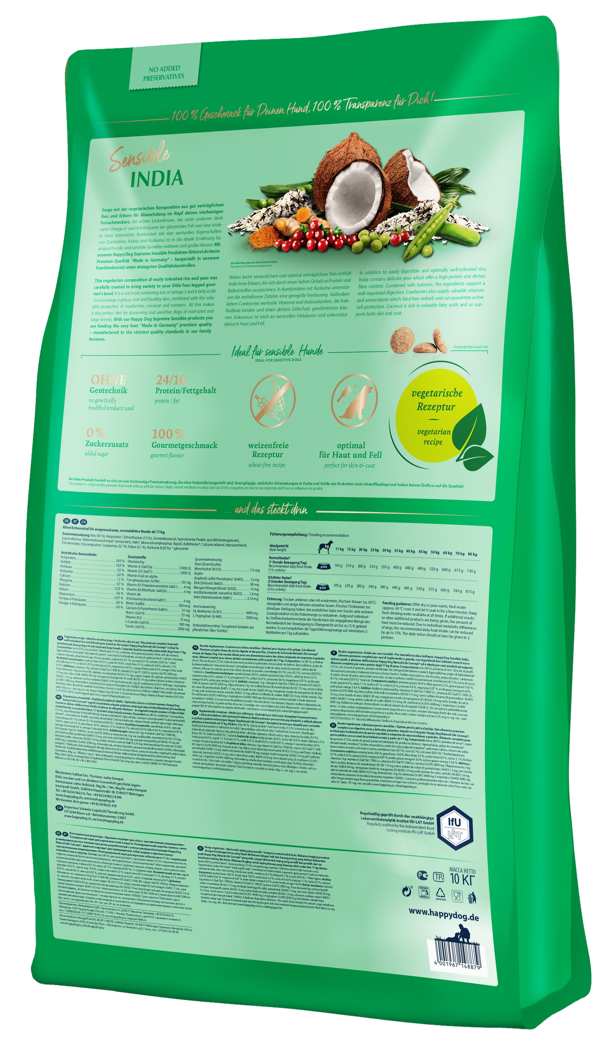 Vegetarian composition with rice, peas and turmeric for sensitive little gourmetsThis vegetarian recipe with well-tolerated rice and peas was carefully compiled to bring greater variety to your dog’s bowl. It is a real treat containing lots of omega 3 and 6 fatty acids to encourage a glossy coat and healthy skin Combined with the valuable properties of cranberries, coconut and turmeric it is the perfect diet for discerning and sensitive dogs of mid-sized and large breeds. Along with highly digestible and very well tolerated rice, Happy Dog India also contains delicate peas which provide lots of protein and dietary fibre. In combination with turmeric, the other ingredients promote good digestion. Cranberries also supply valuable vitamins and antioxidants which bind free radicals and can guarantee active cell protection. Coconut is rich in valuable fatty acids and so supports the skin and coat.