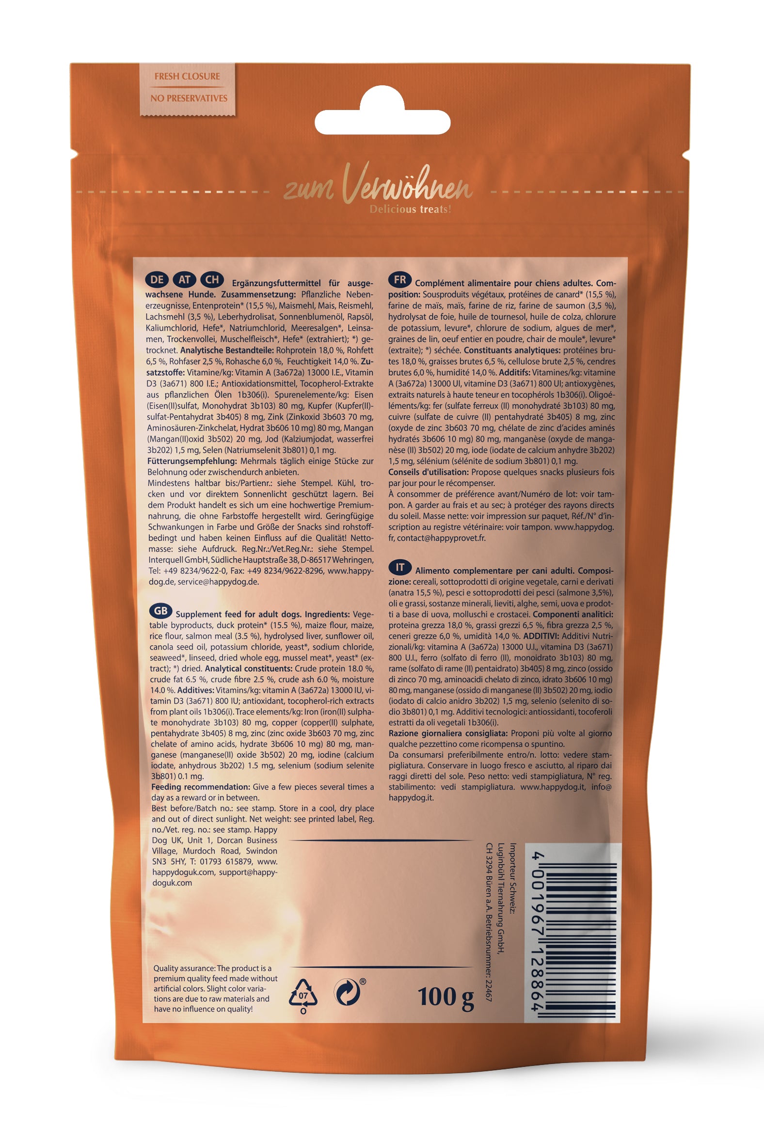 The soft, heart-shaped Snack Toscana is perfect for pampering your pet or as a little meal for in-between times. Easily digestible duck and fine salmon, enhanced with aromatic Mediterranean herbs, is a real taste experience for hard-to-please gourmet pets. The wheat-free recipe with moderate fat content is ideal for medium and large breed dogs who tend to excess weight, for neutered dogs, or for choosy dogs. These snacks are made with no added sugar and are preservative-free. The bag has a closure for re-sealing, so the snacks keep fresher for longer.Â