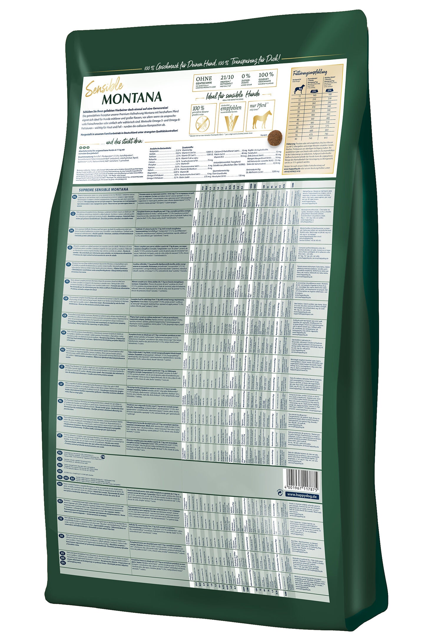 Do you want to pamper your four-legged friend with a real treat? Or do you have a dog with food sensitivities who often has digestive problems or problems with their skin and coat? This may be due to a food intolerance. Single-source protein from horsemeat, and gluten-free potato, make Happy Dog Montana a real taste experience for dogs, including sensitive dogs. Potato contains no gluten, so it can be fed to pets who are grain intolerant. Horsemeat is an unusual and select protein source, and so is very well tolerated. Valuable Omega-3 and Omega-6 fatty acids – important for a healthy skin and shiny coat – round off this exclusive recipe. This makes Supreme Sensible Montana an ideal and balanced dry food for dogs with allergies and food sensitivities.