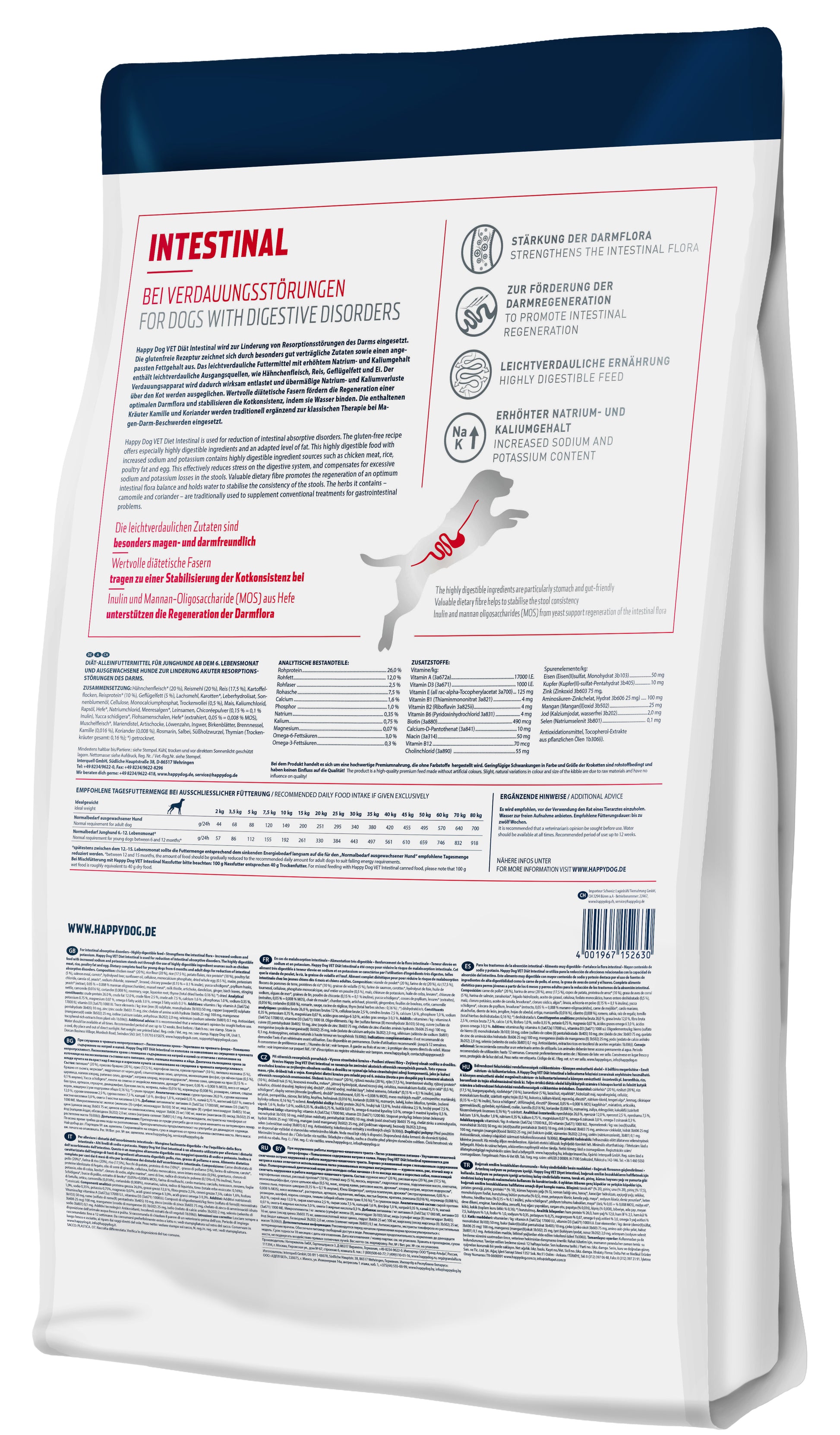 Happy Dog VET Diet Intestinal is used as a dietary complete feed for reduction of intestinal absorptive disorders in young dogs from 6 months and adult dogs. The gluten-free recipe offers especially highly digestible ingredients and an adapted level of fat. This highly digestible feed with increased sodium and potassium contains highly digestible ingredient sources such as chicken meat, rice, poultry fat and egg. This effectively reduces stress on the digestive system and compensates for excessive sodium and potassium losses in the stools. Valuable dietary fibre promotes the regeneration of an optimum intestinal flora balance and holds water to stabilise the consistency of the stools. The herbs it contains – camomile and coriander – are traditionally used to supplement conventional treatments for gastrointestinal problems.