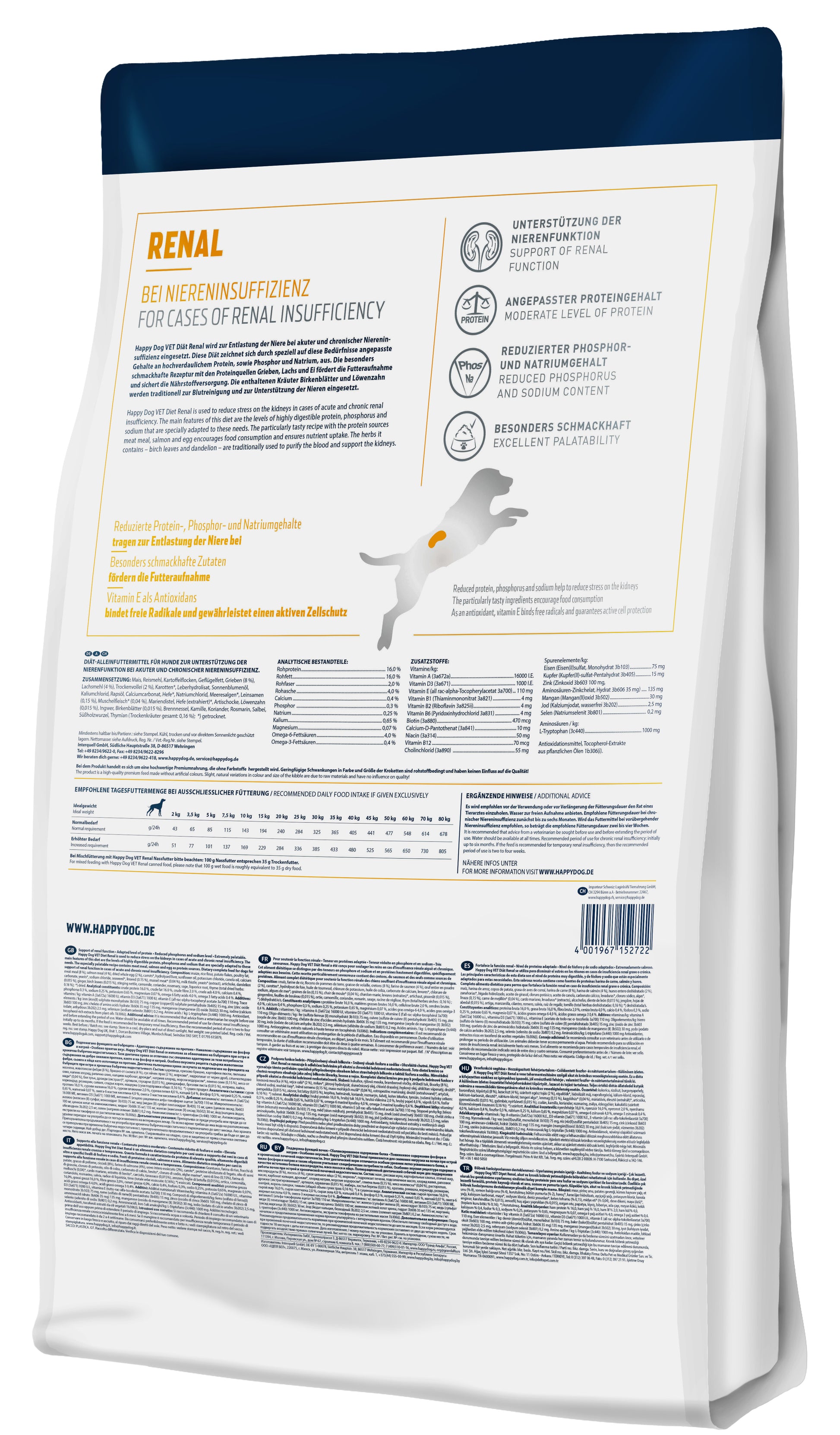 - The recommended period of use for Happy Dog VET Diet Renal is initially up to six months for chronic renal insufficiency. If the feed is recommended for temporary renal insufficiency, the recommended period of use is