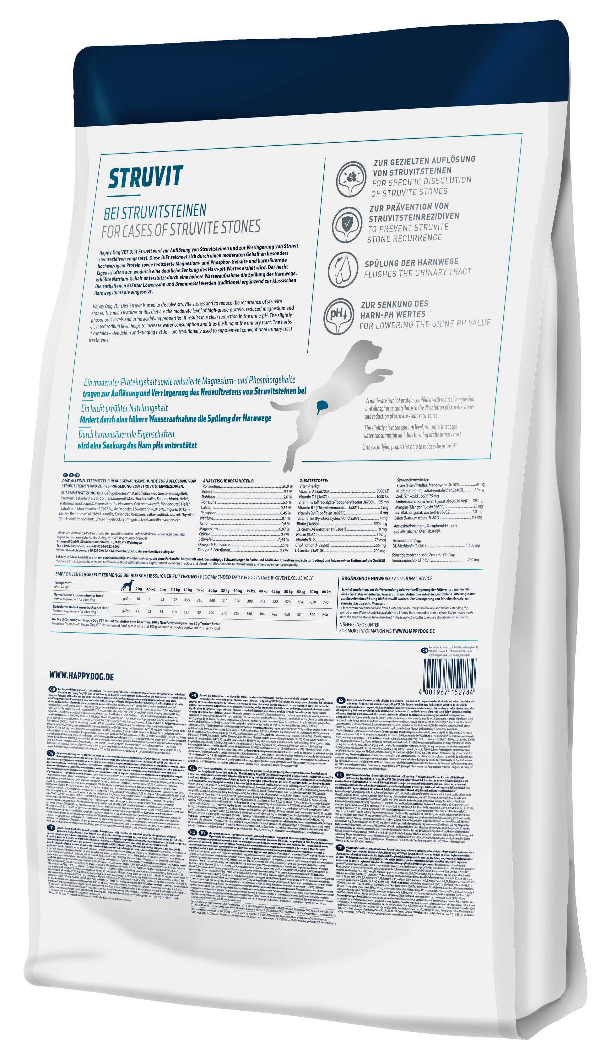- To prevent struvite stones, reduce the specified amount of food (daily requirement) by 20 – 25 % and replace with a normal Happy Dog dry food. Regularly check the urine pH.